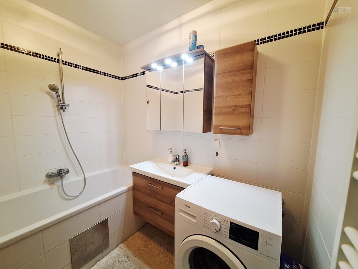 Vom zentralen Vorzimmer aus sind sämtliche Räume separat begehbar. Das Badezimmer ist mit einer Badewanne, einer Waschmaschine sowie einem Handtuchheizkörper ausgestattet. Ein separates WC mit Handwaschbecken und ein praktischer Abstellraum ergänzen das Raumangebot optimal- alle auf den Fotos sichtbaren Möbelstücke sind im Mietpreis enthalten.